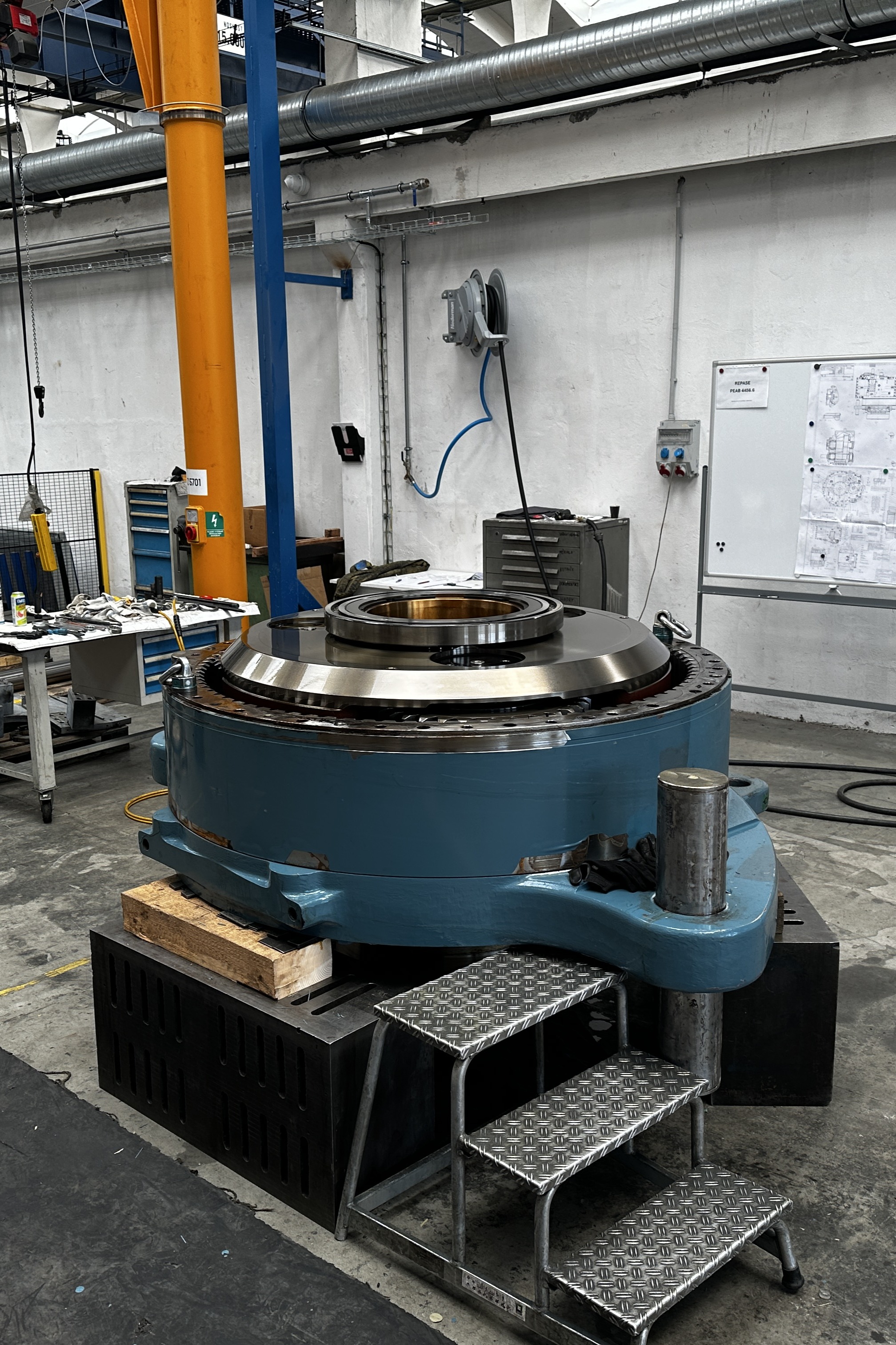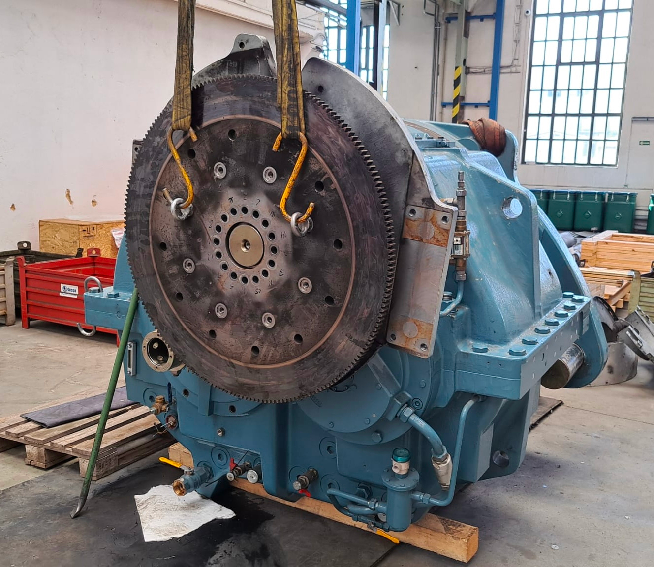 Generální oprava zahrnovala úplnou demontáž a detailní defektoskopii všech vnitřních komponent. Pro dosažení maximální odolnosti proti tvorbě mikrotrhlin (WEC) jsme provedli kompletní výměnu ložisek za nová s povrchovou úpravou černěním (black oxide). Všechny stupně ozubení byly pečlivě prověřeny a v případě potřeby přesně opracovány pro dosažení optimálního nakontaktování v záběru. Jednotka byla vybavena novým elektrickým olejovým čerpadlem, mazacím blokem s pokročilou filtrací a renovovaným brzdovým systémem. Po přísném zátěžovém testu, který ověřil parametry v reálném provozu, byla převodovka profesionálně nalakována a dodána v režimu „plug-and-play“, připravena k okamžité instalaci do gondoly.