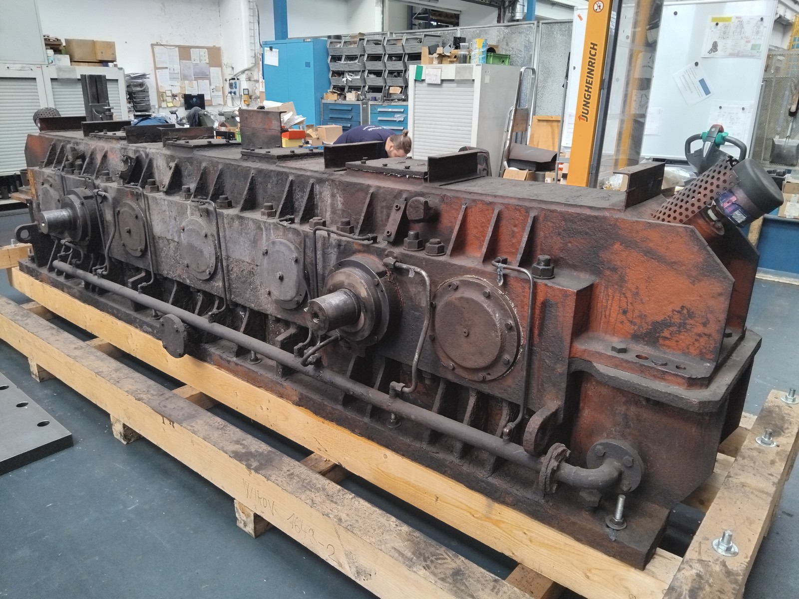 The inspection revealed extreme structural corrosion, with the gearbox housing showing material loss of up to 12 mm. Our engineers determined that a full housing replacement was necessary to ensure structural integrity. Furthermore, the internal components—including damaged gear teeth, power shafts, and bearings—as well as all fastening hardware (nuts and screws) were slated for total replacement. By identifying these critical failures early, Wikov provided a roadmap to transform a rusted, decommissioned asset back into a high-performance synchronous drive, ensuring continued production reliability for the steel mill.